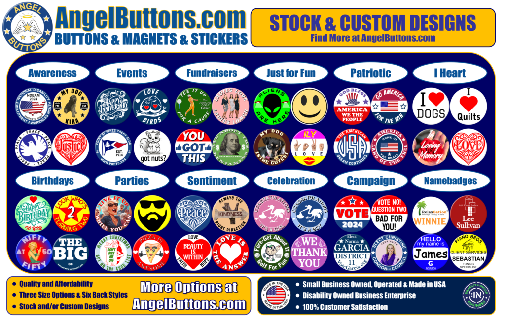 Our “Occasions” collection features handcrafted, USA-made buttons designed to add joy, personality, and purpose to life’s most memorable moments.  Whether you are blowing out birthday candles, celebrating a retirement, or hosting a backyard bash, Angel Buttons bring people together with a smile and a keepsake.  Explore our four themed sections: Birthdays, Events, Parties, and Celebrations each filled with unique, made in the USA button designs crafted to make memories last.  Our buttons become mementos that have a lasting impact for years to come.