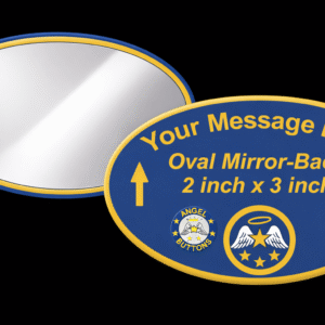 Custom 2×3 inch oval mirror-back buttons offer wide format visibility for logos, names, or phrases. Rounded edges for comfort. Ideal for conferences, badges, and event branding.